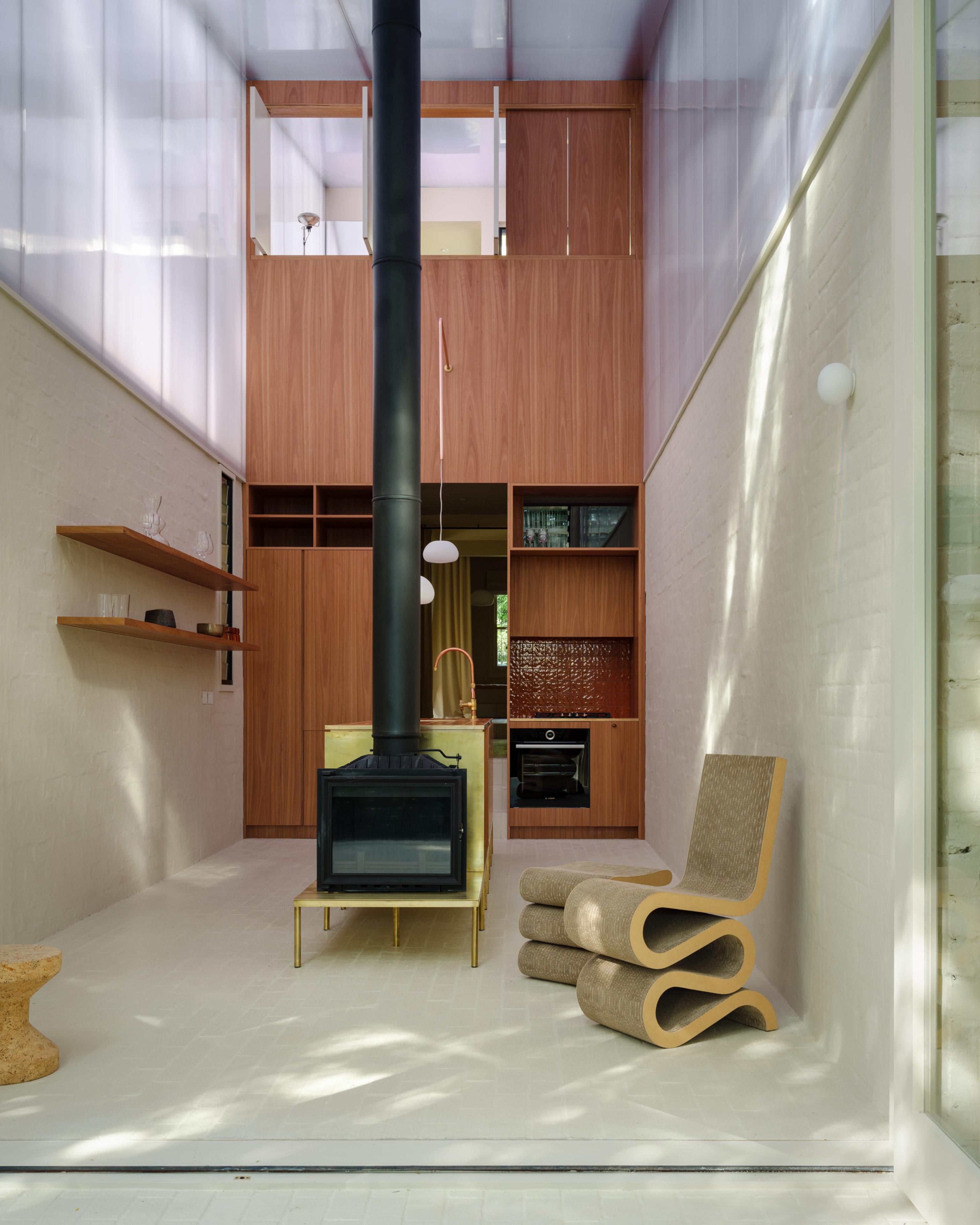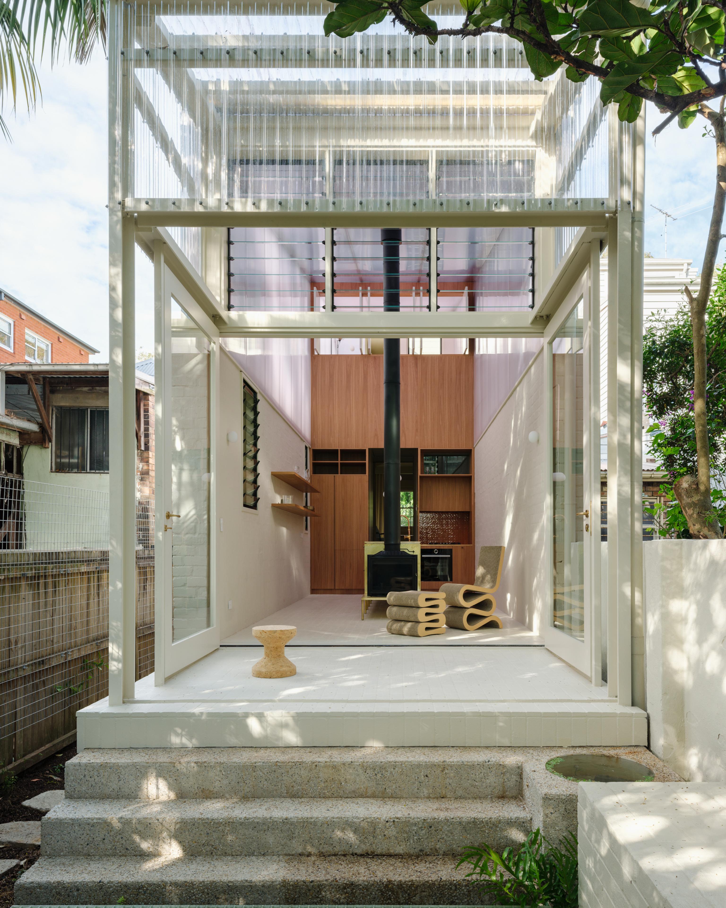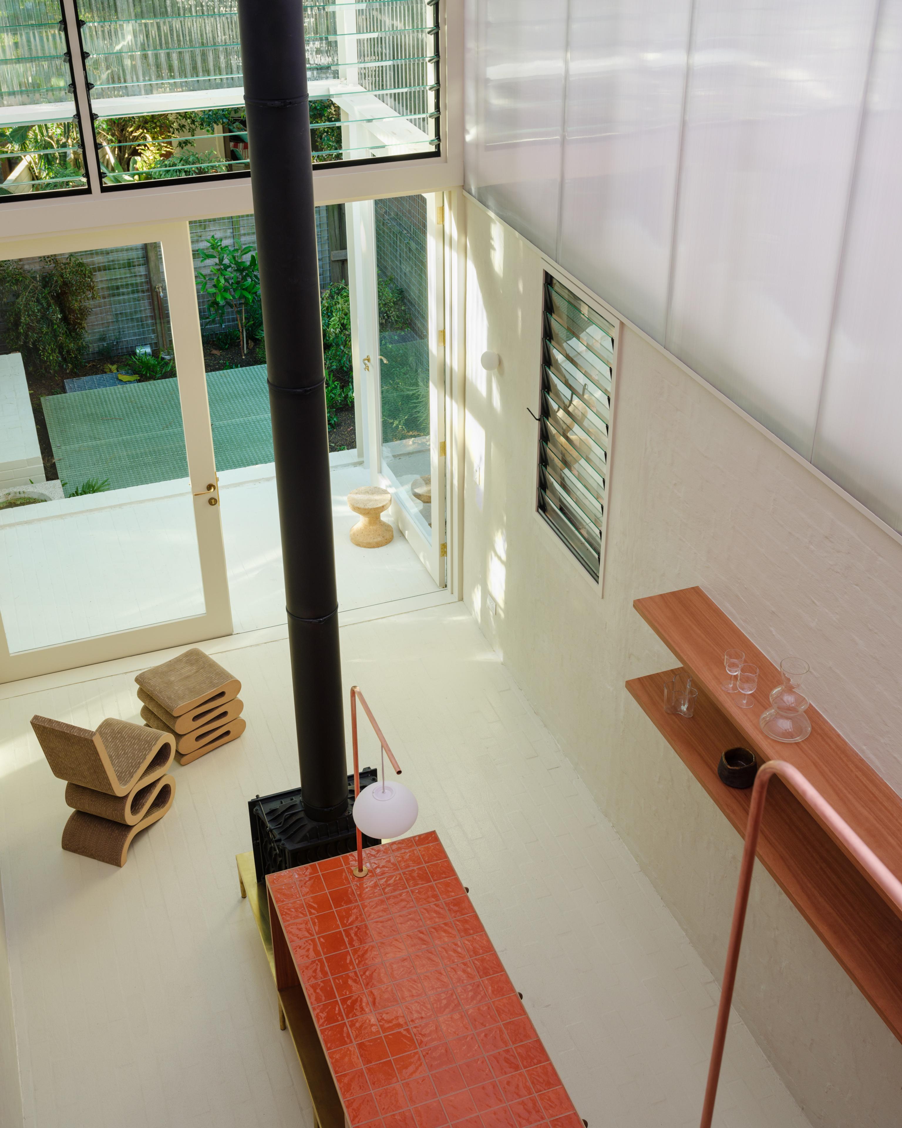 The second bedroom is referred to as a loft, with apertures that open to the living spaces below. And rather than the simple glass box added to the rear, benefiting from the site’s northern orientation, Architect George opted for a double-height six-metre space (like the void over the dining area) and clad this with polycarbonate – triple layered inside for thermal insulation and a single layer on the exterior awning for sun protection.