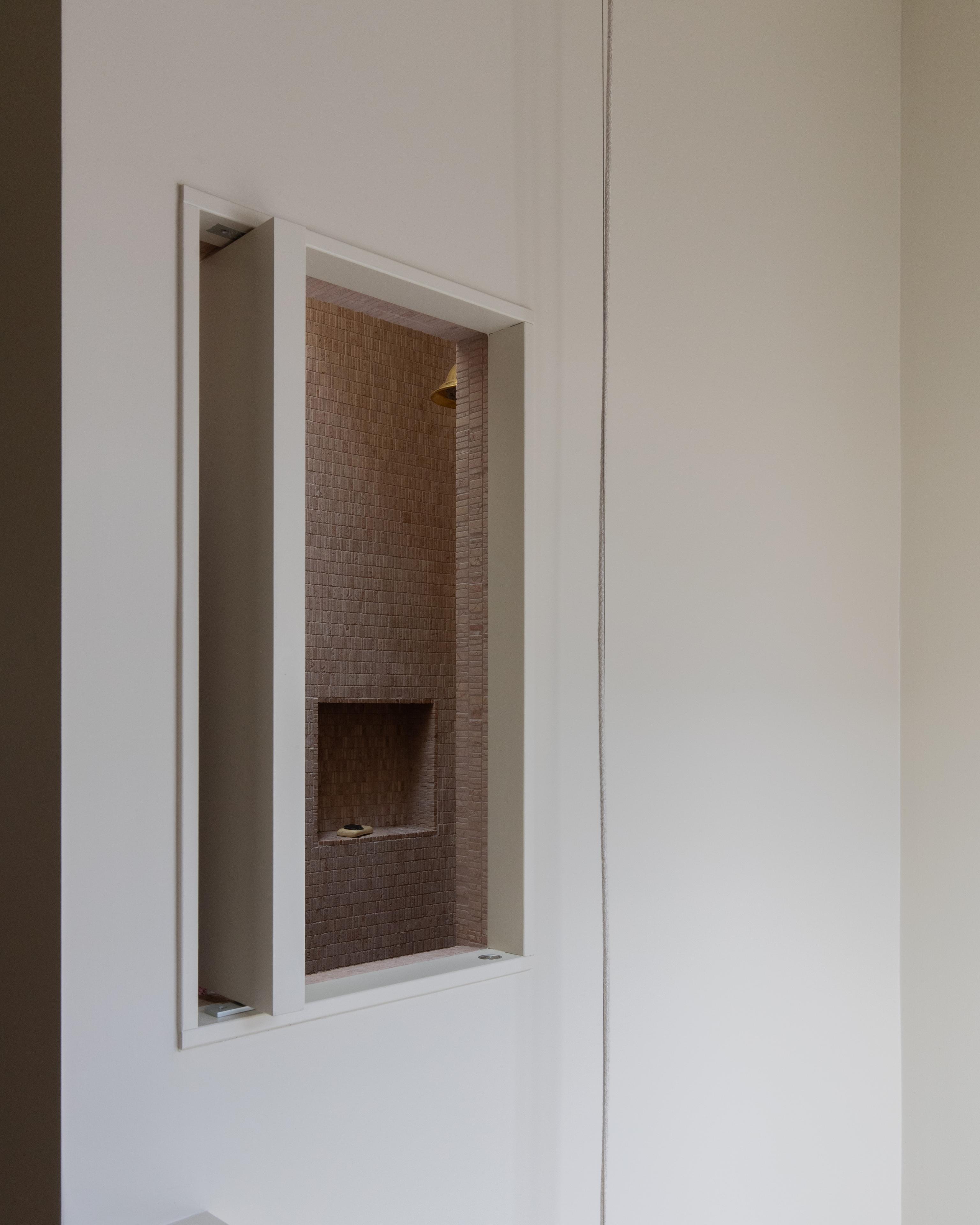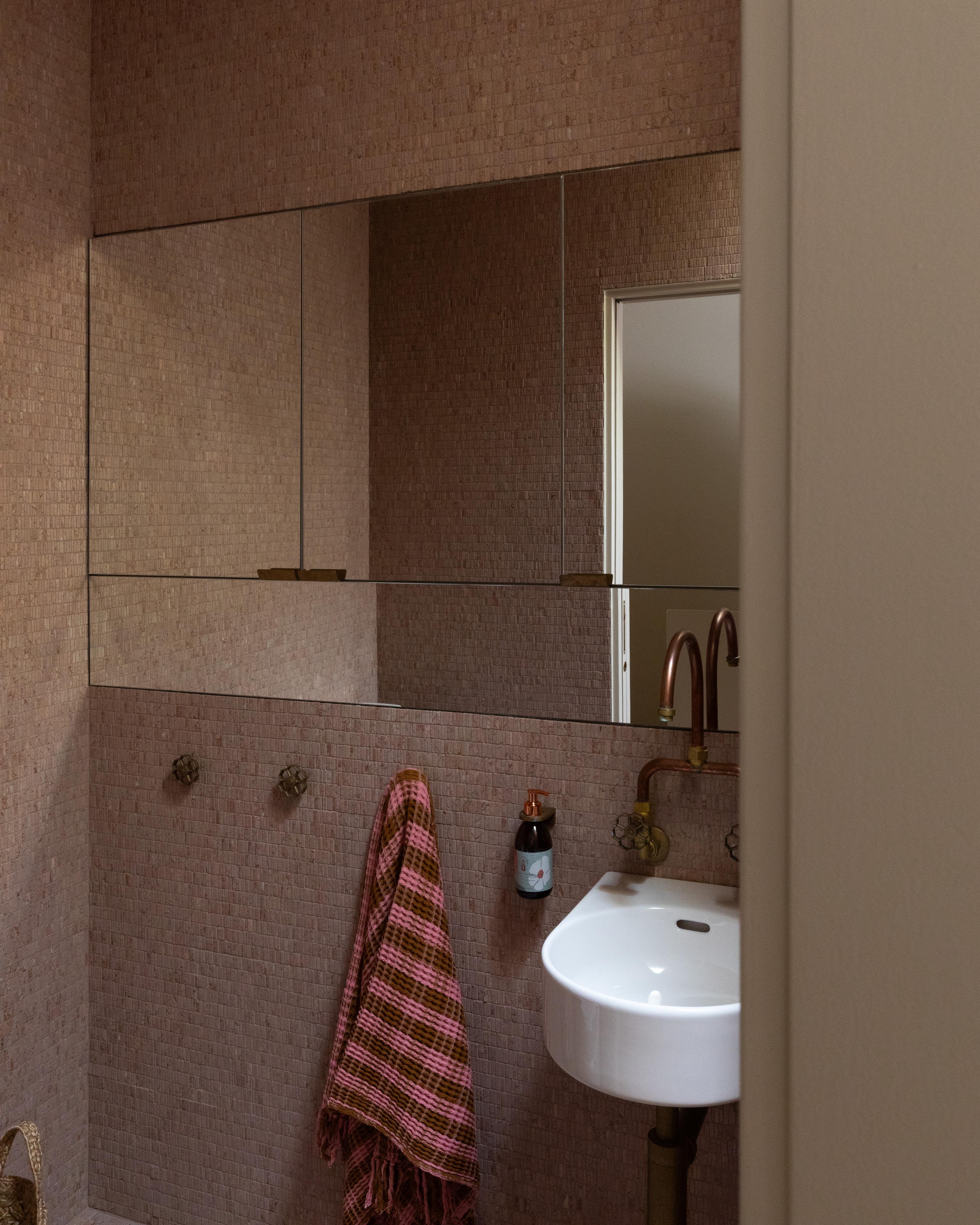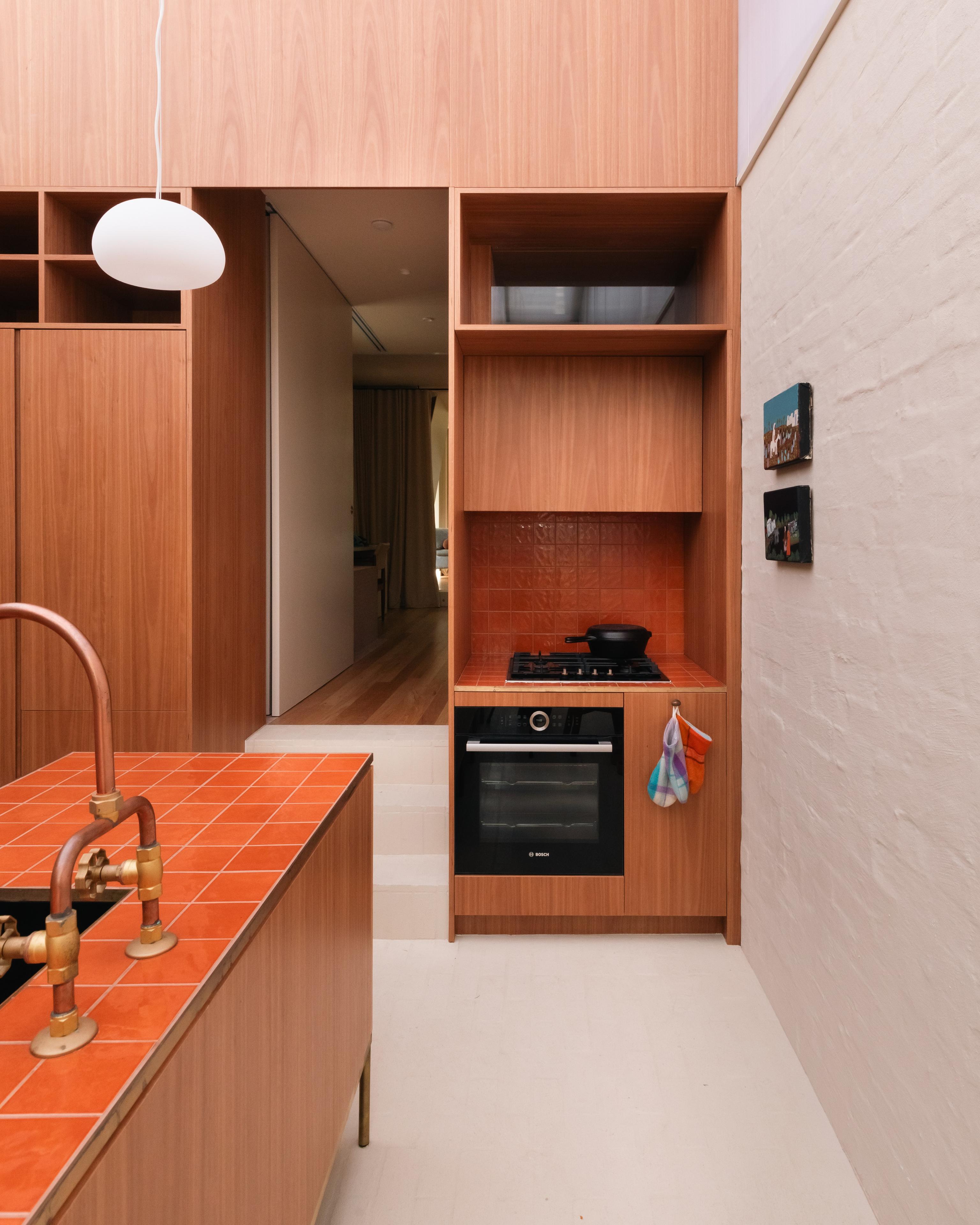 At the threshold of the new kitchen is one of the highly used areas, with a studio for the owner that contains two built-in tables – one high and the other low. The higher desk-style table which allows for a standing position conceals a bed, referred to as the ‘coffin bed’ as it comes with an operable lid. The owner also wanted a bath as part of the brief, something that for many, would be impossible to provide, given the size of the house. However, with just a few moves, timber sliding doors are opened to reveal a tiled bath on one side of the main passage and on the other a more traditional bathroom with a shower, a sink and a toilet. “The design was as much about creating flexible spaces as well as finding beds for the children,” says Williams, who retained the main bedroom upstairs, located at the front of the house, as well as a second upstairs bedroom, but in a very different format.