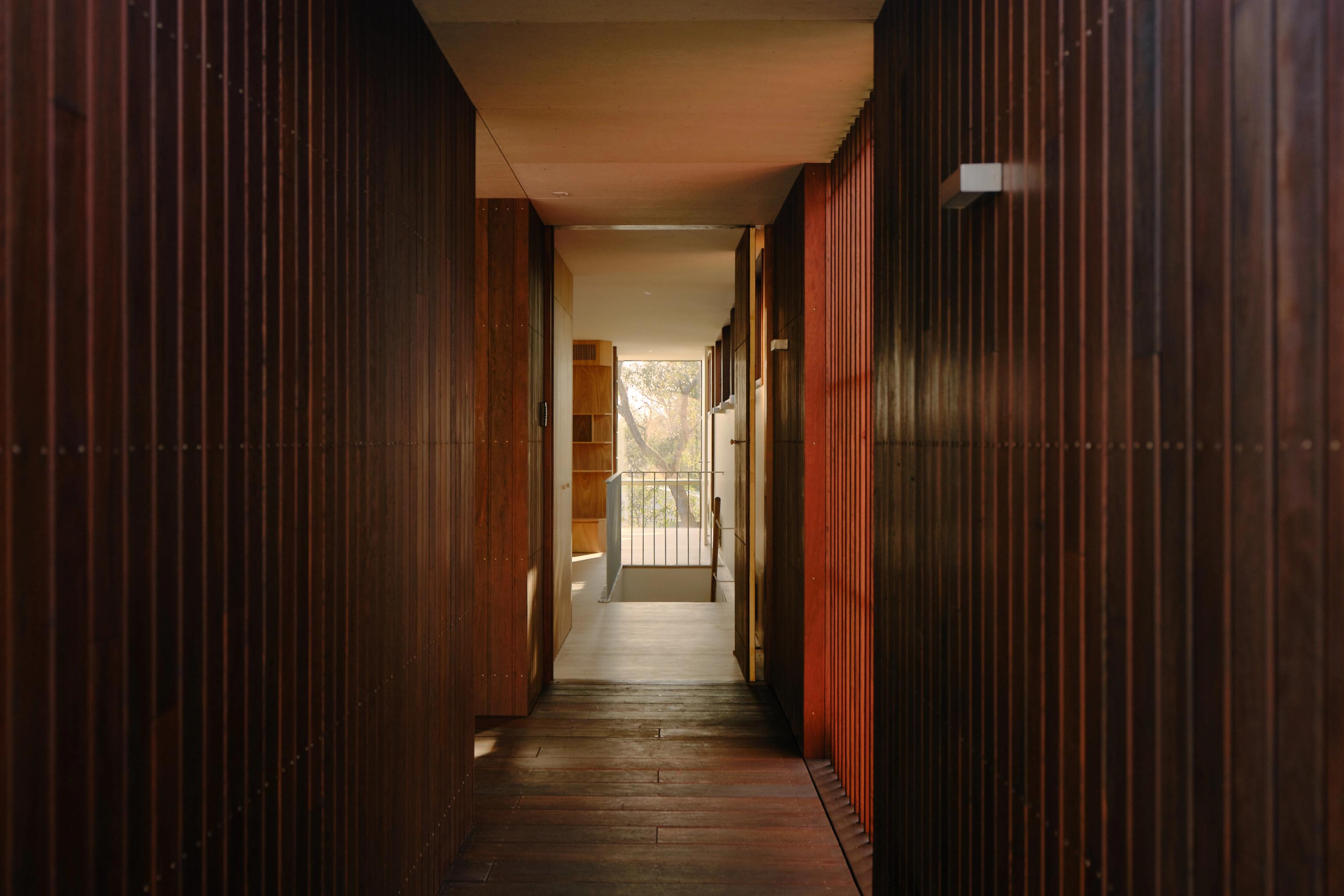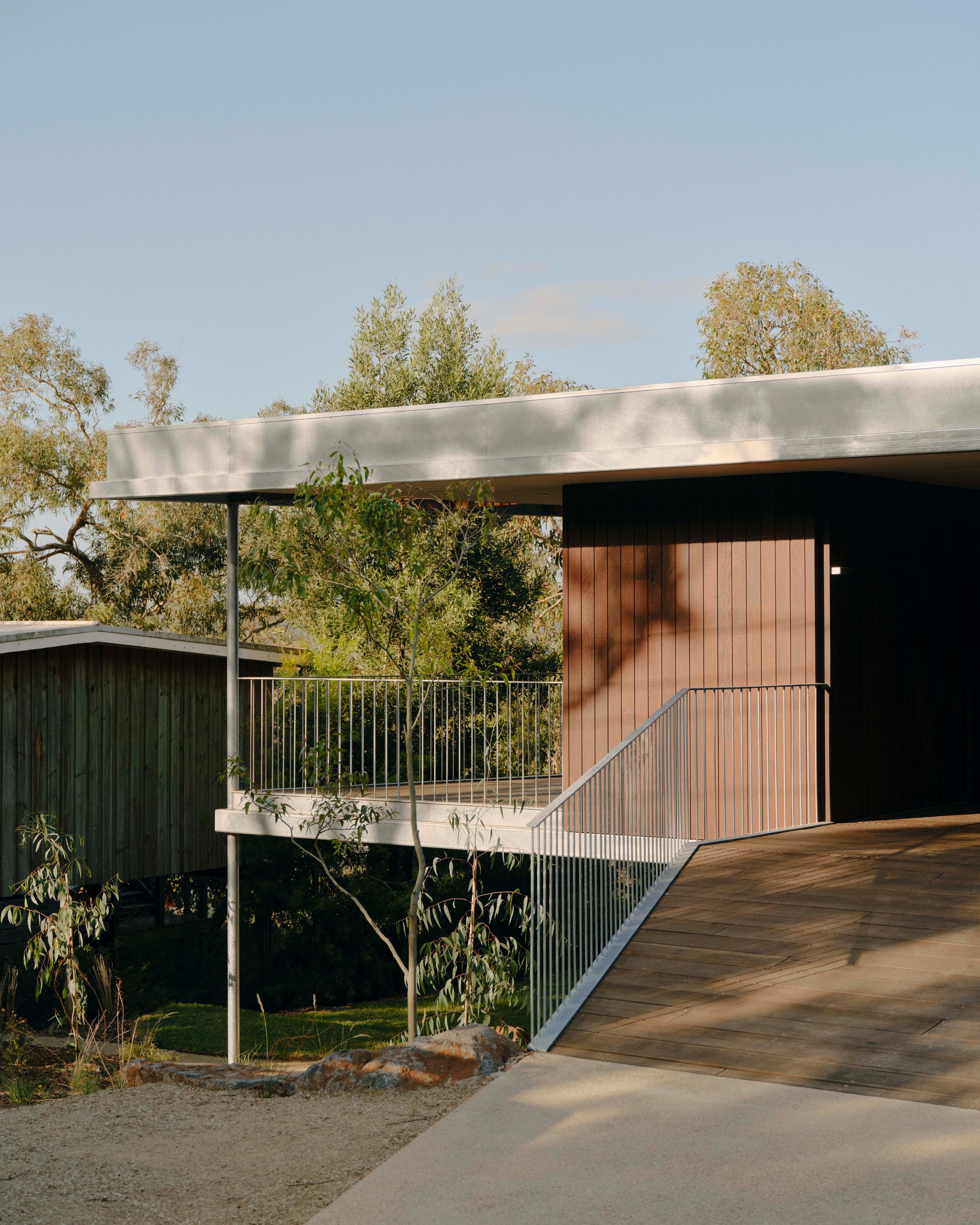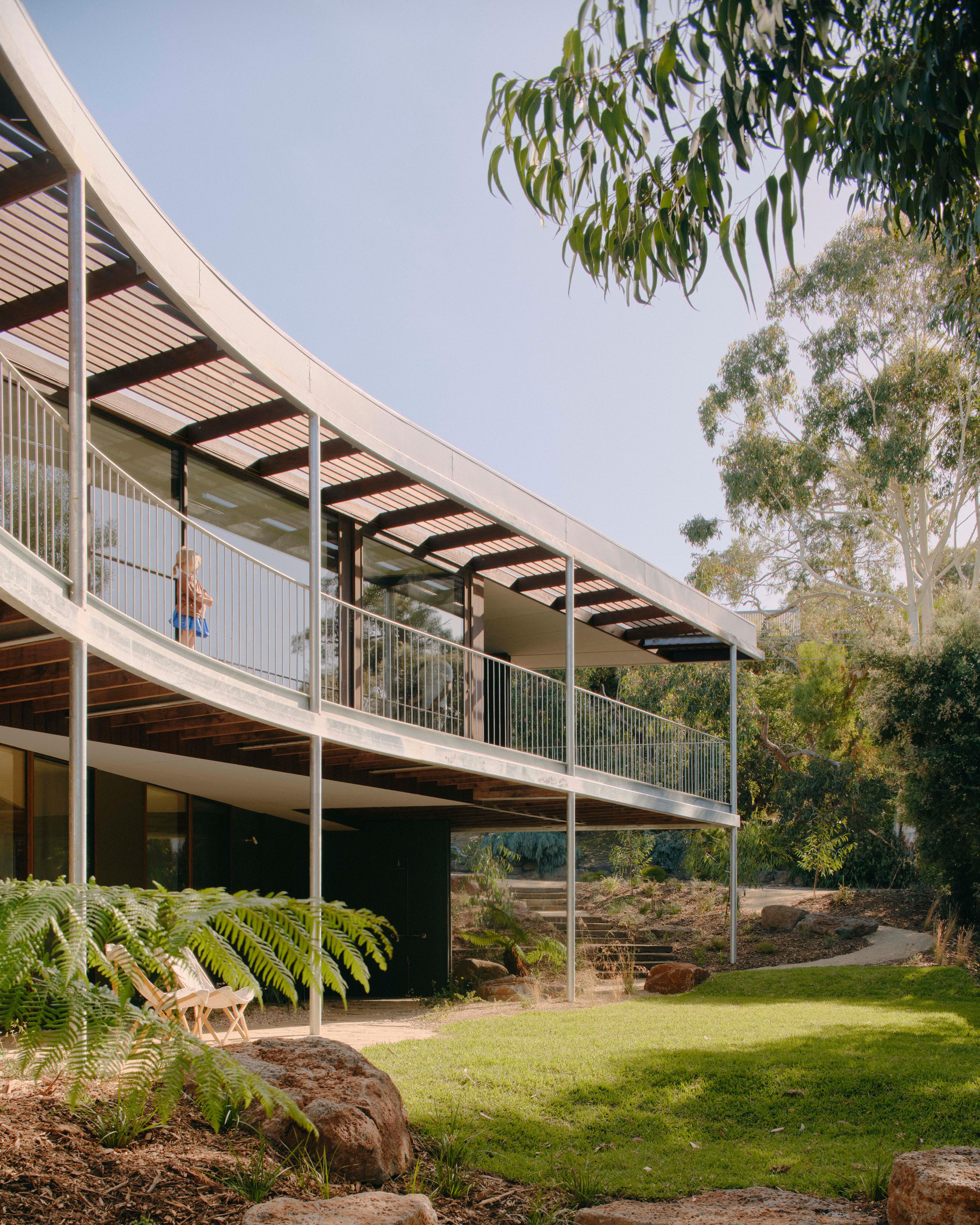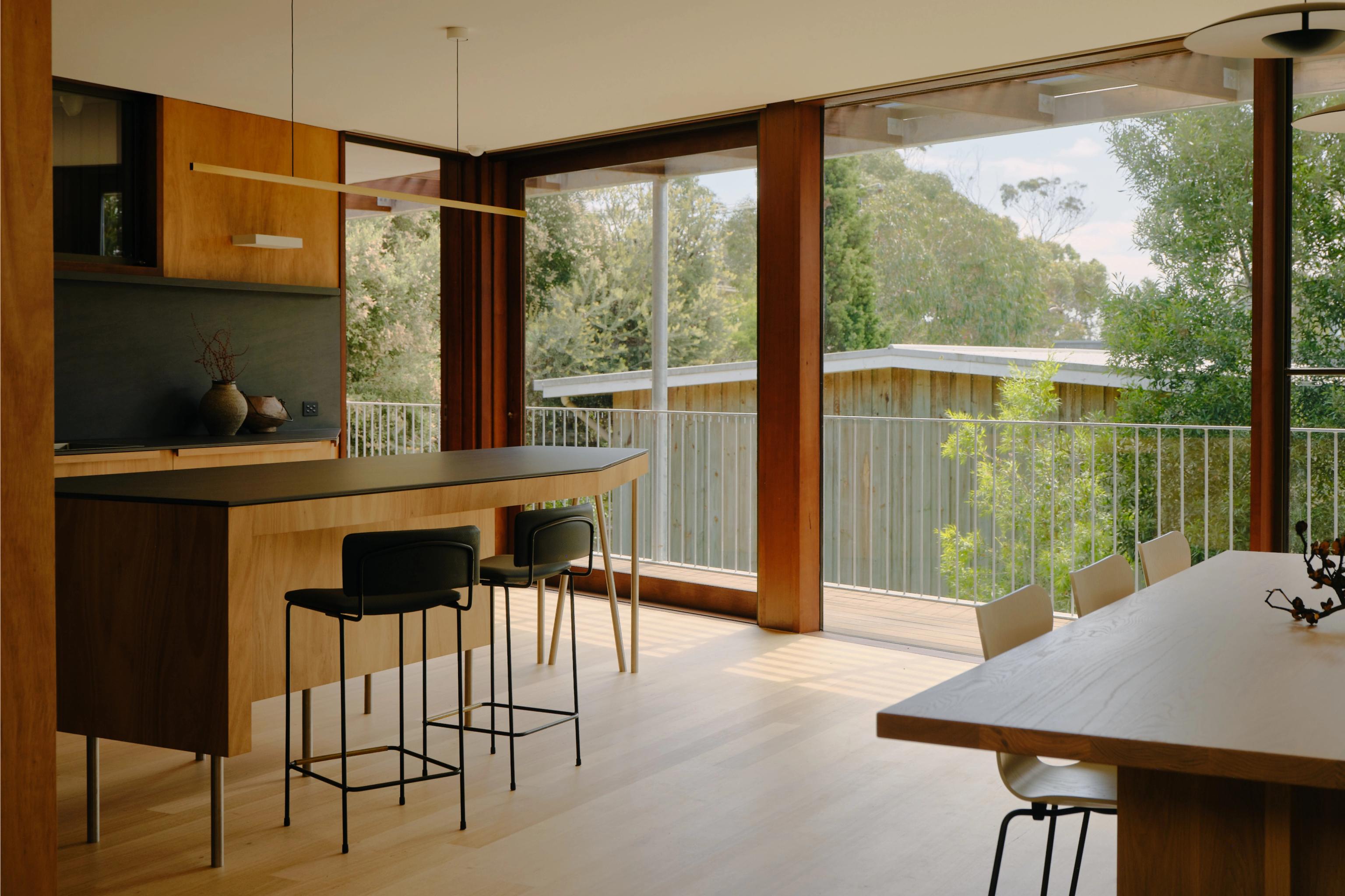 Clad in locally sourced ironbark, the house forms a curve on its northern edge to embrace both the light and views over the Anglesea township. “This house was inspired by the local context with many houses built on stilts. Unfortunately, many of these simple fibro homes are being replaced by large houses more commonly found in major cities,” says Clarke.