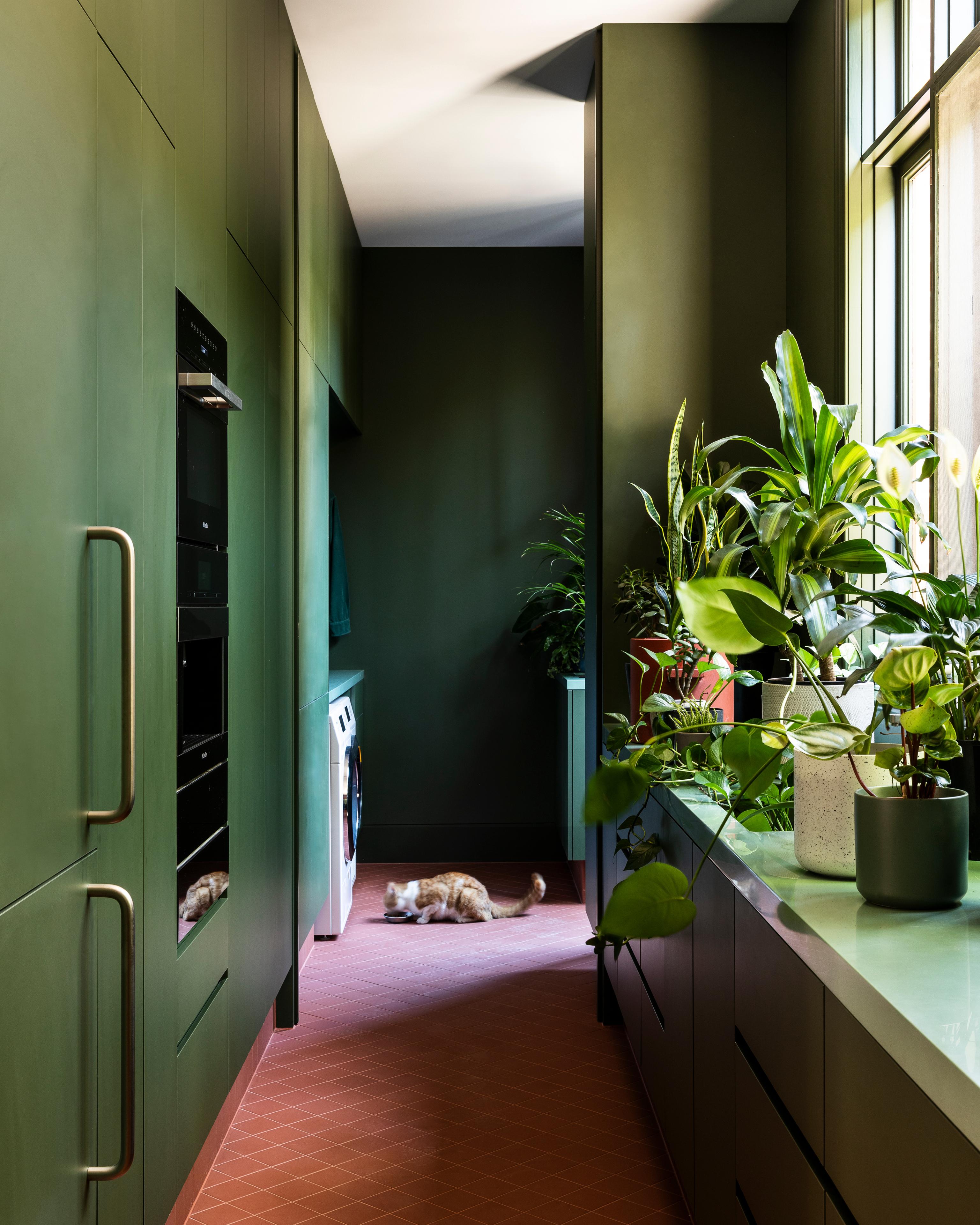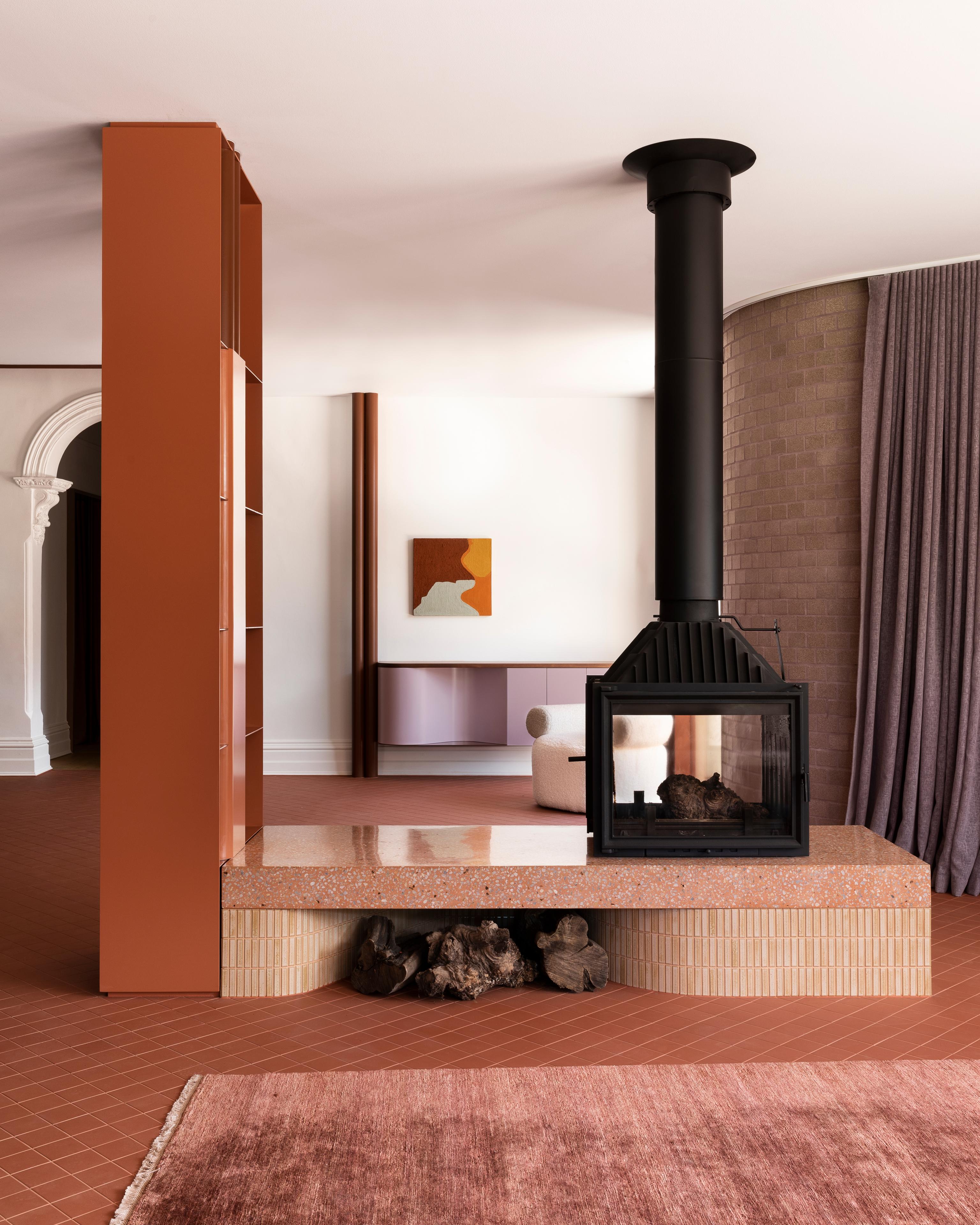 In contrast to the faux Federation-style kitchen and compartmentalised dining and living areas, the new ‘nugget’ comprises a contemporary kitchen and open plan living and dining areas – the elevated potbelly-style fireplace and new steel shelves loosely delineate the one large space. And replacing the former chalky-white walls, the new wing is imbued with colour, something the practice is known for. Splayed bagged exterior walls, for example, are in a soft mauve hue, while the kitchen island bench features a rust-coloured two-pack painted base and a pink resin bench top. For the kitchen joinery, there’s a eucalypt green that creates a ‘dialogue’ with the garden designed by Amanda Oliver. And tucked behind the kitchen is a butler’s pantry-come-mud room, decked out in a deep forest green. Adding to the sense of lightness are the linen curtains in the living area that become ‘animated’ when the glass doors are retracted during the warmer months of the year.