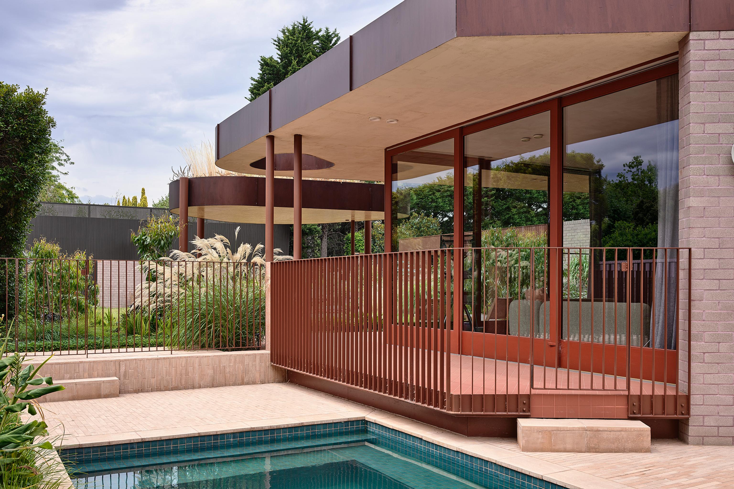Although the process of combining the various architectural styles of the original home was relatively straightforward, using an ox blood hue on the exterior detailing, the creation of a contemporary wing within the 1990s addition was more challenging. Rather than slice off part of the home’s rear elevation, Wowowa Architecture took the approach of inserting an organic-shaped nugget-like form. This form was partly driven by delineating the more recent past from the present. It was also partially derived from an image of a modernist house in Brazil, complete with a massive boulder that ‘pierces’ the home’s generous glazing. Although a massive rock wasn’t on this large property or near any perimeter walls, there was the opportunity to create curvaceous glazing around the existing pool that would also increase the light.
