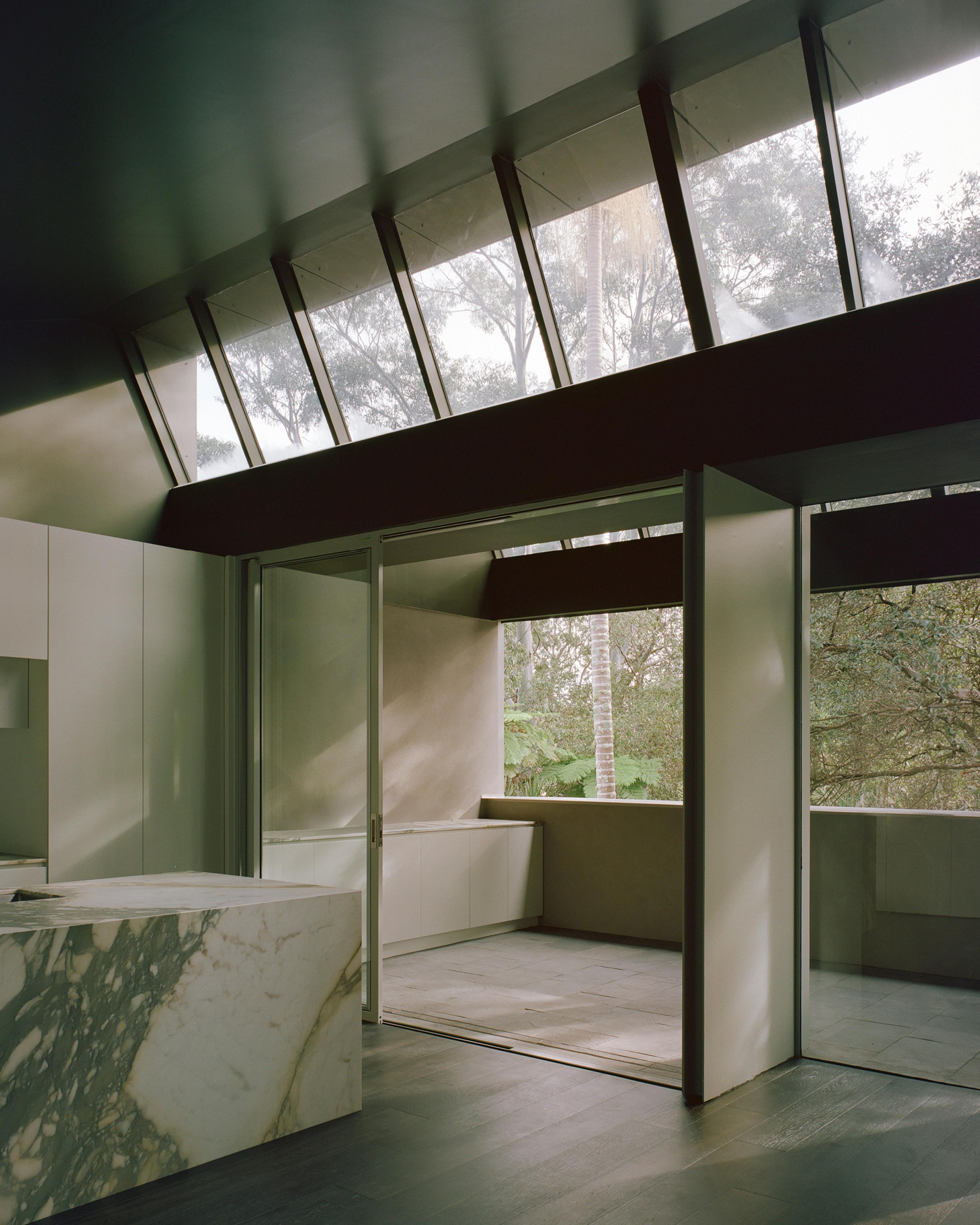 The main kitchen on the first level, for example, features an island bench, completely clad in marble, with the kitchen’s splashback reflecting the light from the sawtooth roof. The L-shaped kitchen also contains a wall of joinery that allows the functions of the kitchen to be removed. “I wanted the eye to focus outwards to the garden or to the dense canopy above,” says Seegers, pointing out the established eucalypts on the site.