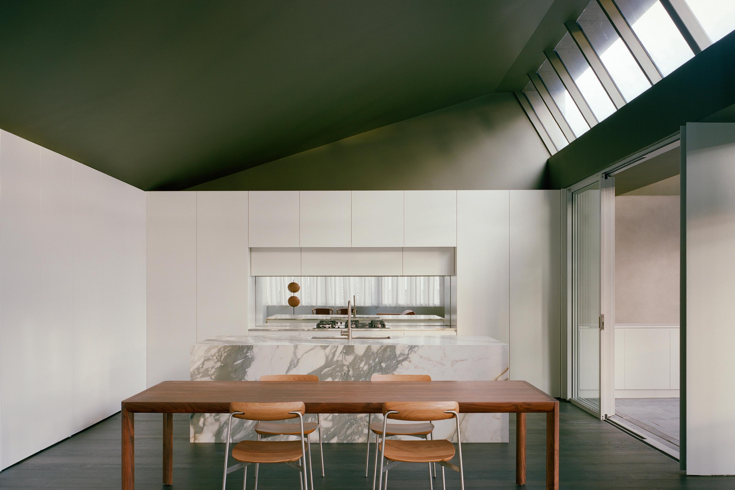 Designed for a multi-generational family, the Lane Cove house, with its dramatic sawtooth roof, creates a distinctive silhouette in the wide leafy streetscape the area is known for. “I was fascinated by the history of the area, but I was continually drawn to the landscape, the point where the trees meet the sky and the presence of water from the harbour,” says Seegers, pointing out the datum lines where the sawtooth roof, painted in a metallic dark green shipbuilder’s paint meets the home’s cream brick rendered walls. While the roof form was beneficial for scooping light into the two-storey house, Seegers was also mindful of the established turpentine tree at the front of the property, changing the original roof design to accommodate this tree from a second living area/additional bedroom located on the first floor.