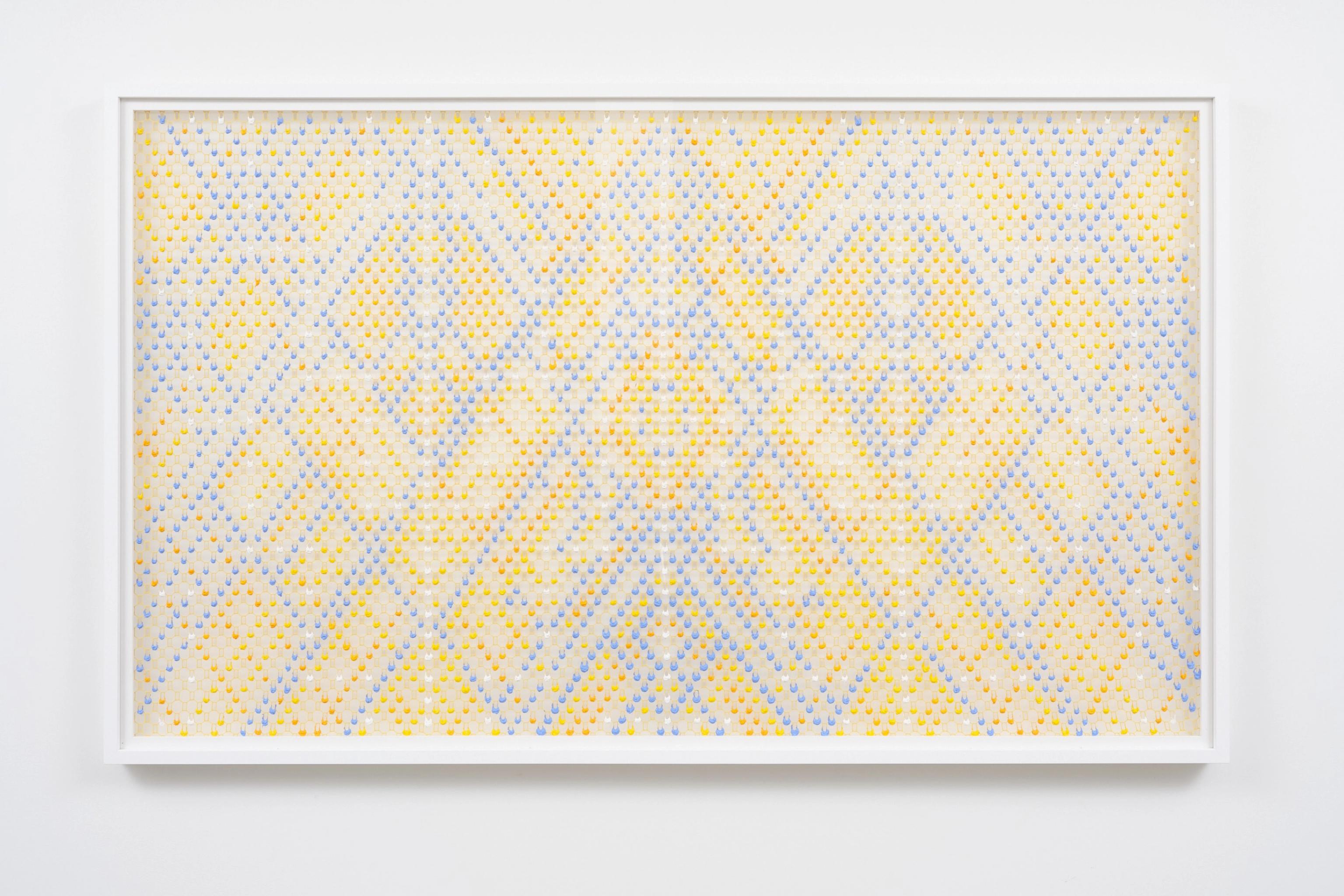 Pulled by the gentle current of bodies, the next standout from afar was signalled by radiant sunshine hues haloing into Carriageworks' epic volumes. Represented by Aotearoa gallery Paulnache, Peata Larkin’s collection of acrylic on embroidered silk works titled Kei konei koe _You are here, reflected the strength of artistic evolution, cultural exchange, and craft—themes that continued throughout to become a constellation, activators of perception and expression.