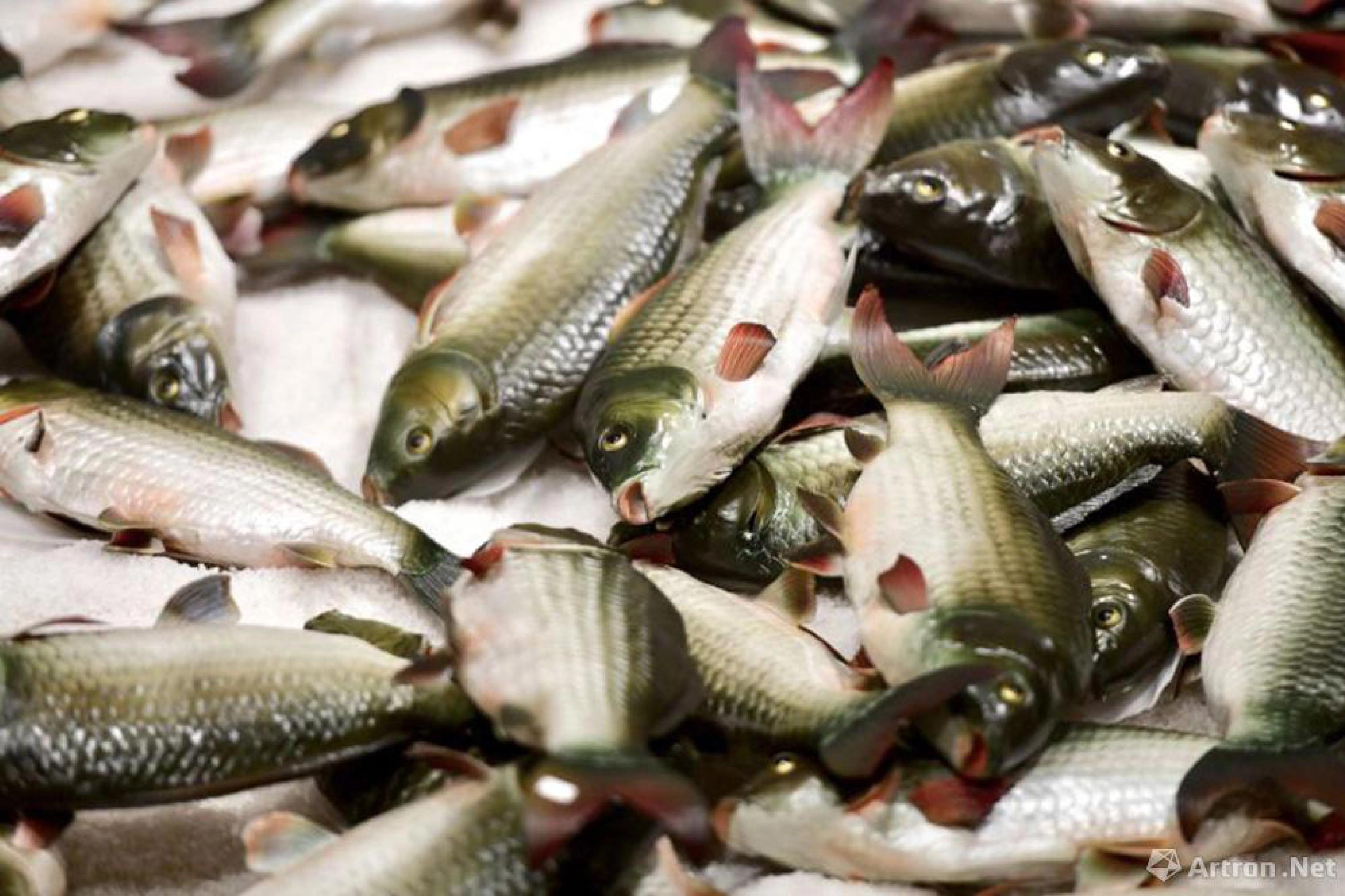 Shen Shaomin, Chinese Carp Canned (Installation View), 2018. Machinery, silicone, plastic, electronics, salt, 35.6 x 14.5x6cm. Redbase Art, Sydney, Australia.