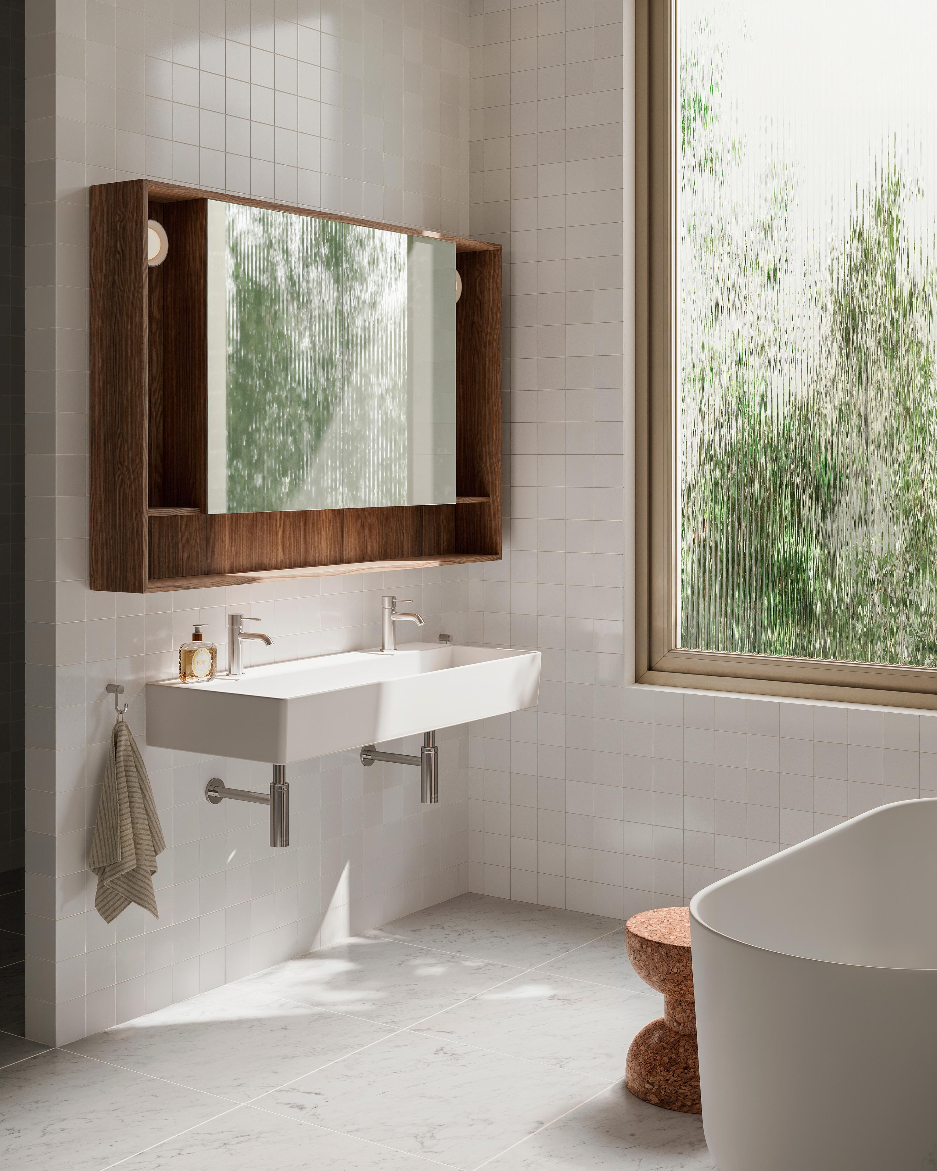 Bathrooms balance warmth and functionality with a tactile material palette of marble, ceramic white tiles, and warm cabinetry that interacts nicely with natural light. Integrated storage, stainless-steel fixtures and feature lighting enhance ease of use, while freestanding bathtubs and wall-hung basins contribute to a generous and calming atmosphere.