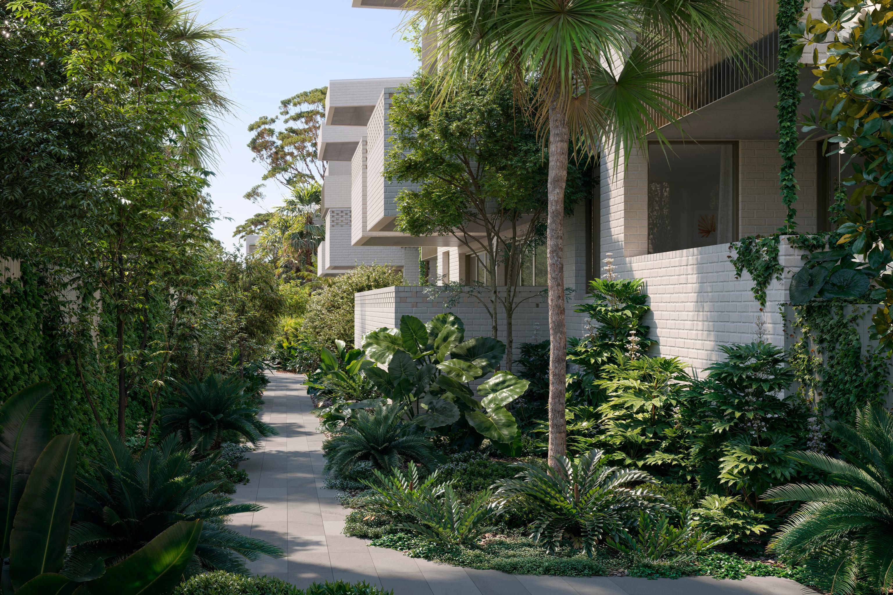 Myles Baldwin Design brings a bold and expressive landscape to 97 Alma Road. Inspired by St Kilda’s old-world glamour, which echoes the golden age of Hollywood, the landscaping combines natives and non-natives with a focus on leafy greenery, signature plantings, dramatic foliage and rhythmic patterns to create a dynamic setting that will evolves with the seasons.