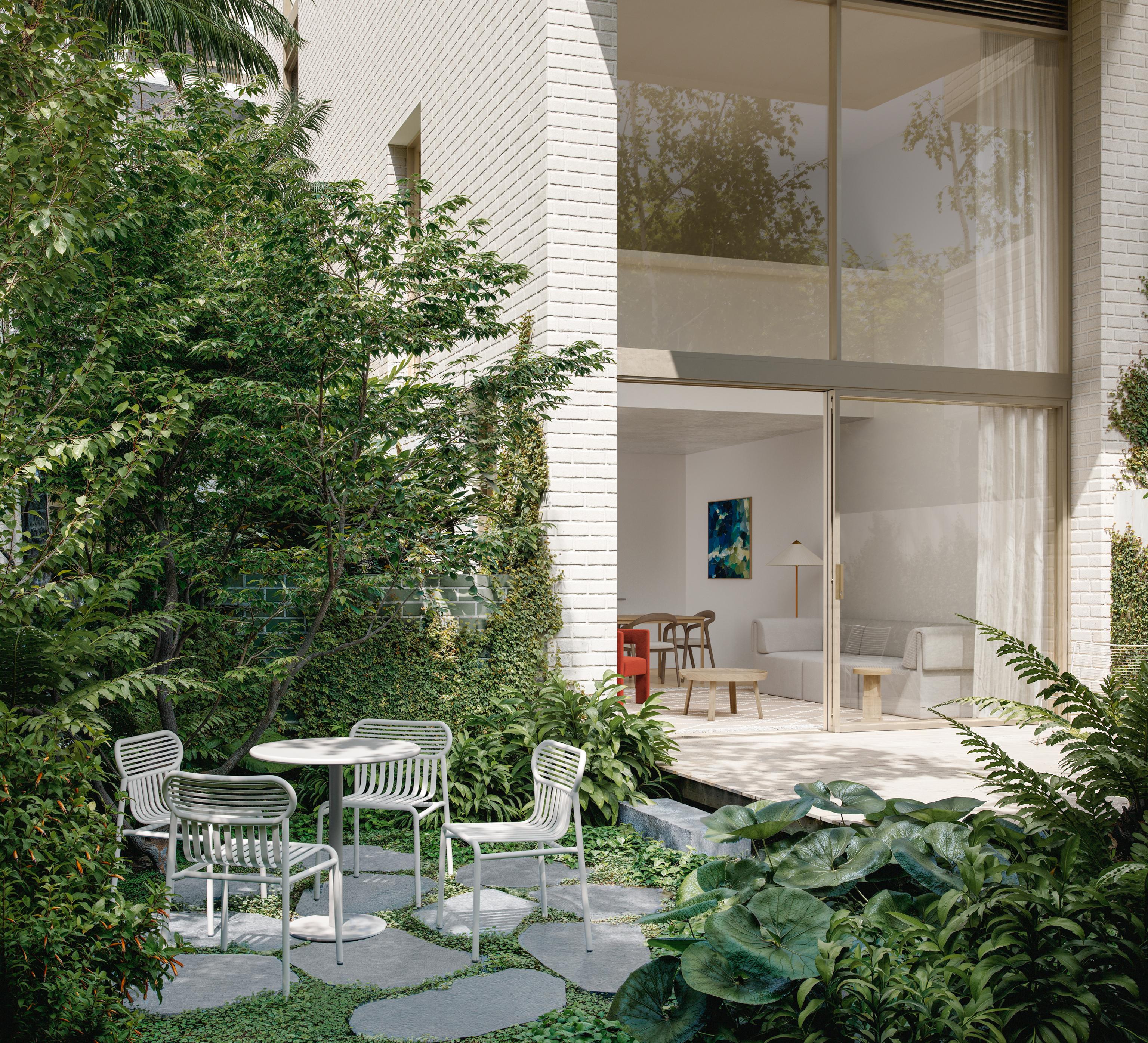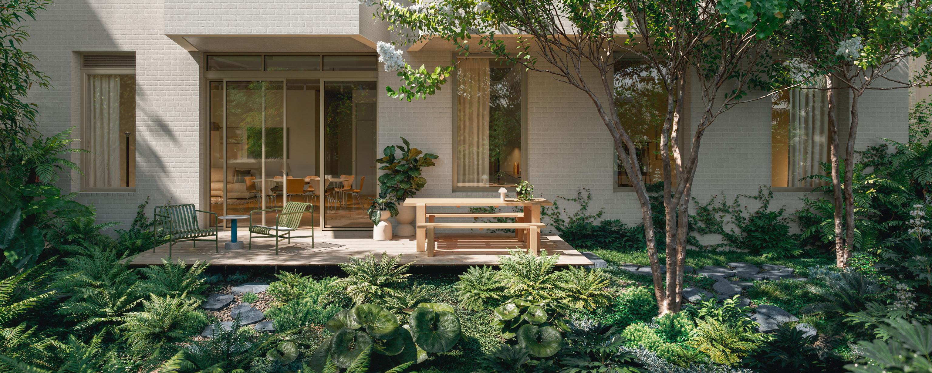 Ground-floor apartments benefit from extensive gardens designed for entertaining.
