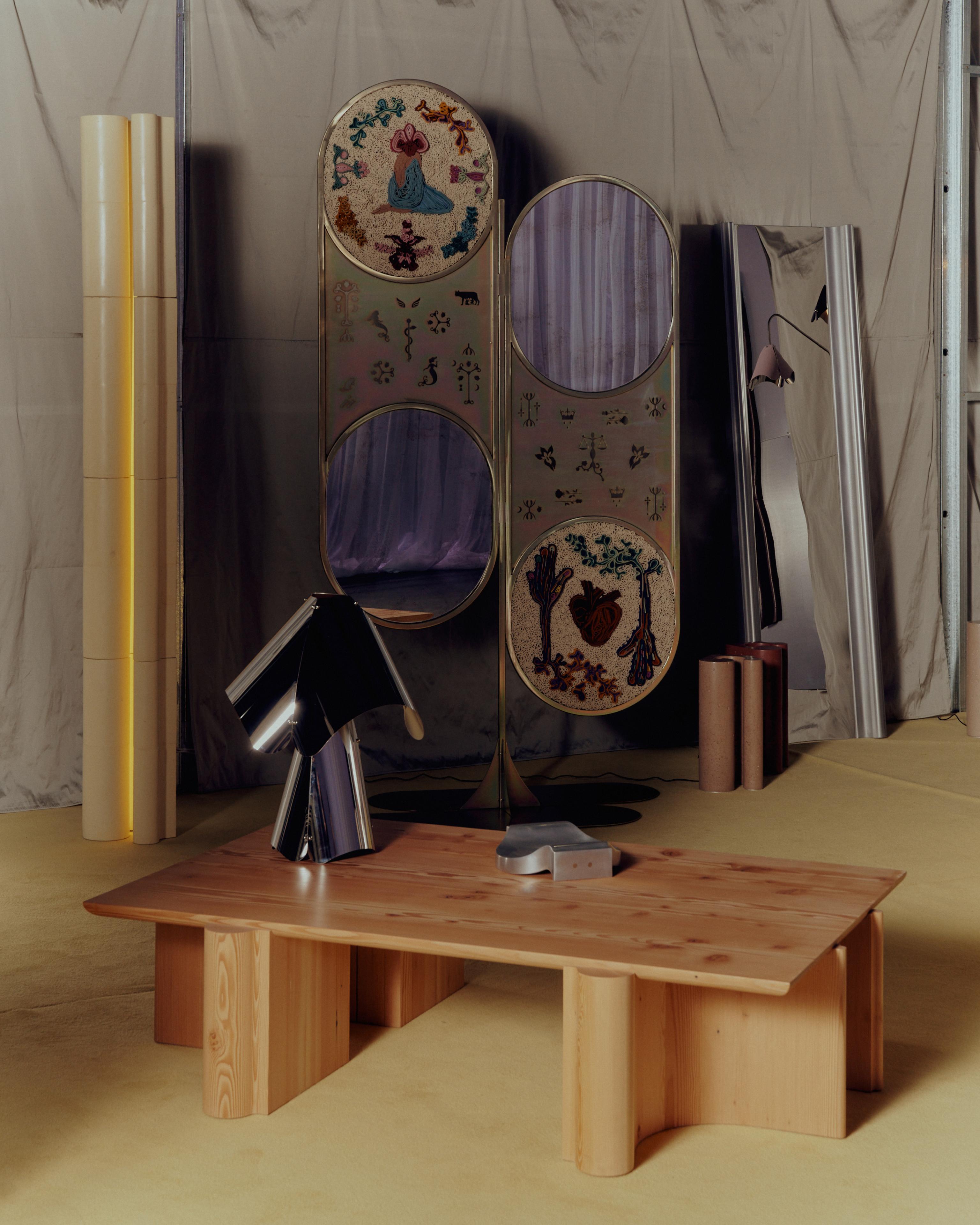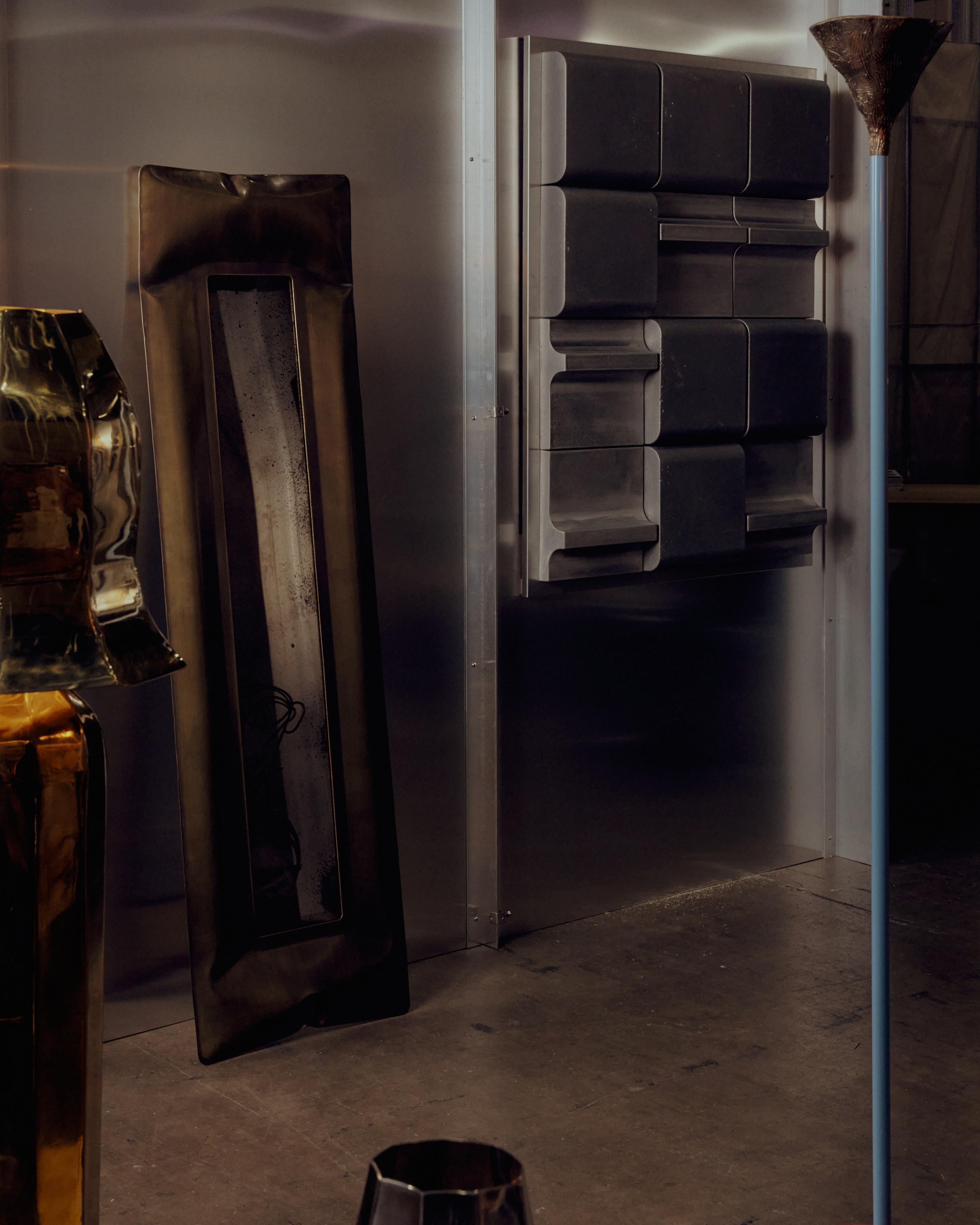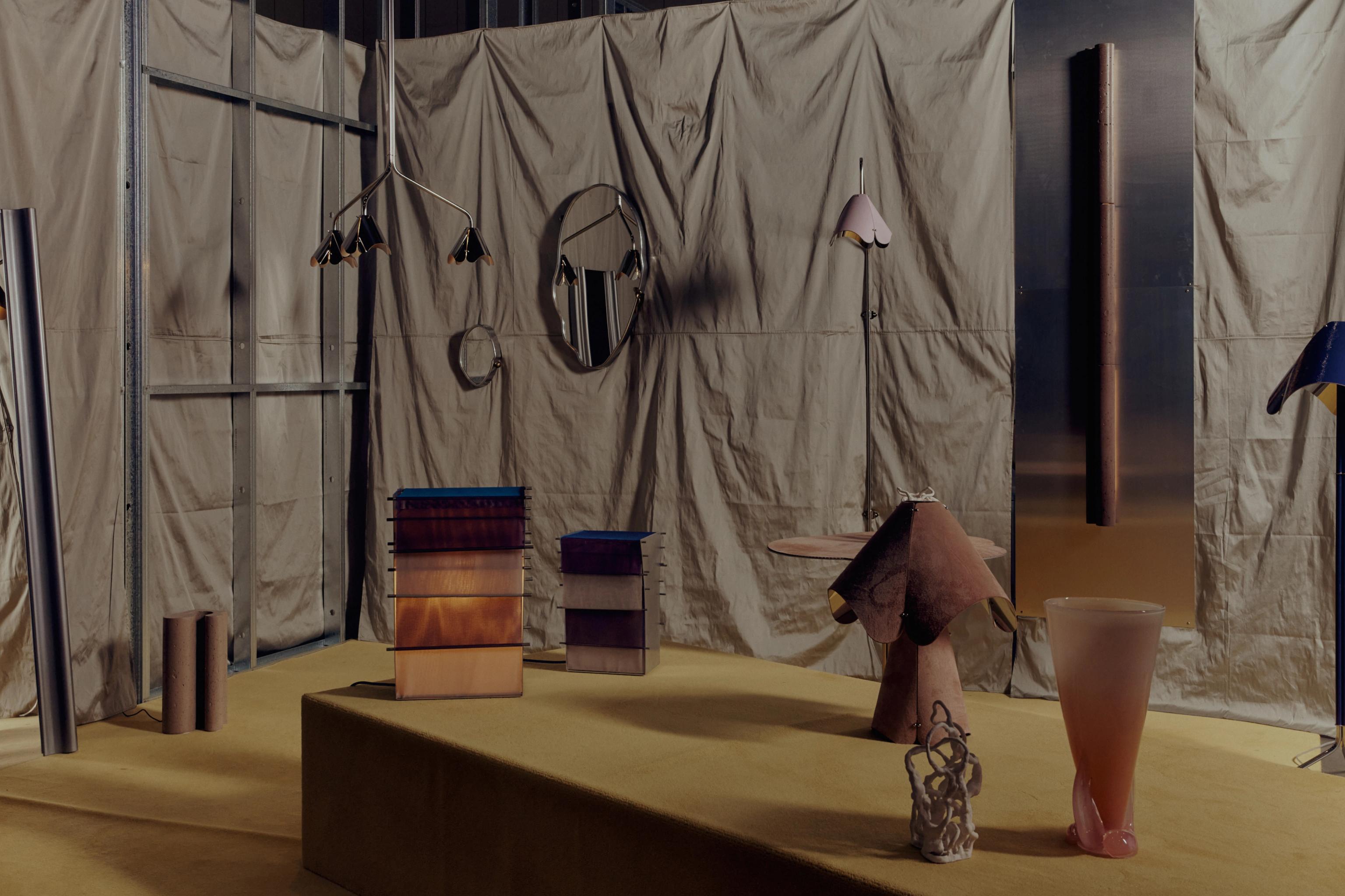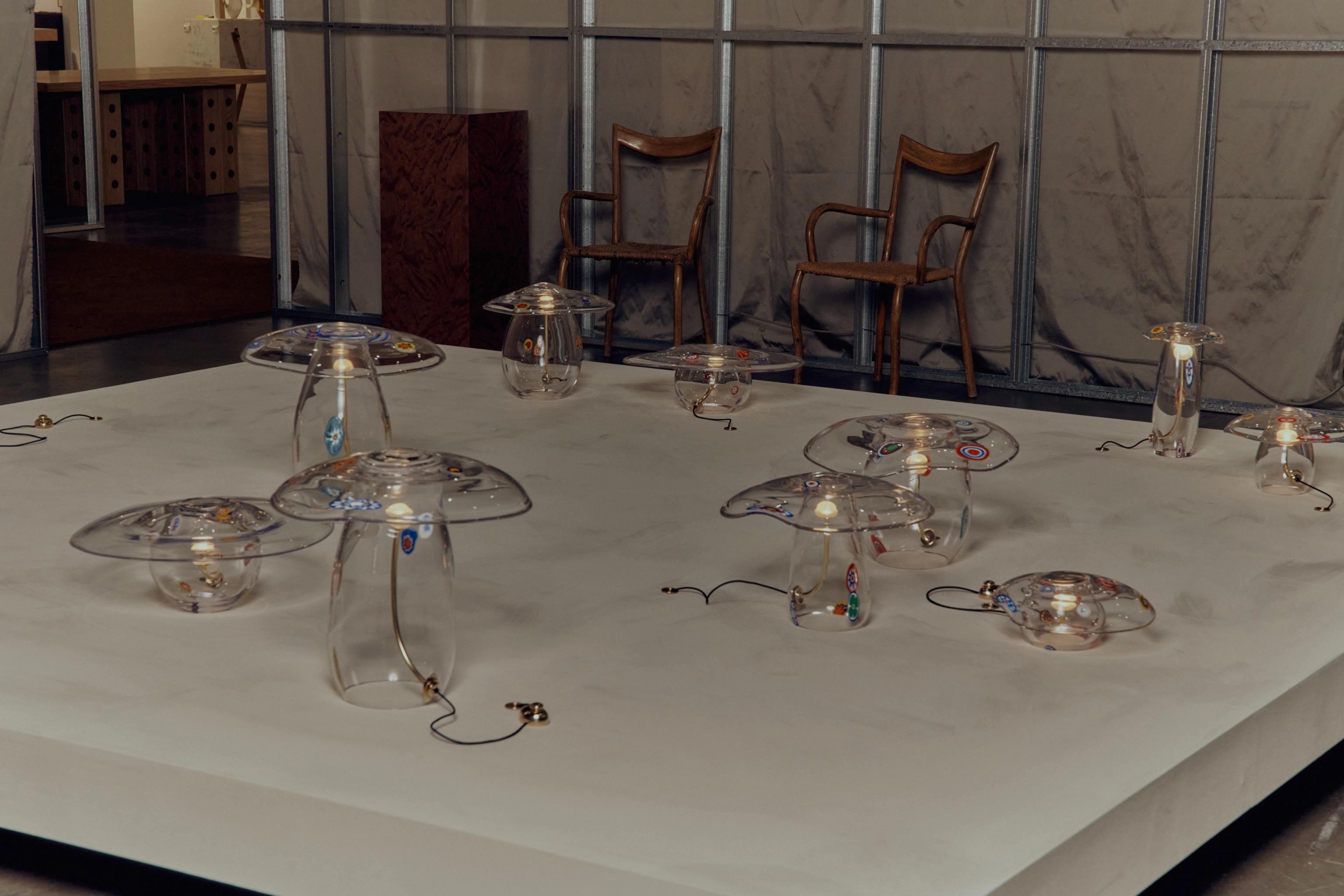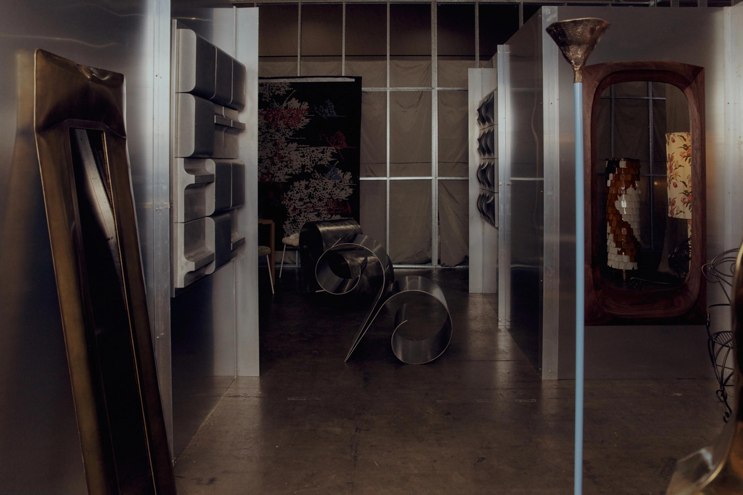The material language was immediately legible. Mirror surfaces and frosted glass. Burnished silk alongside pewter steel. Bulbous objects that trapped light like rainbows compressed into form, suspended above a wobbly, arrested landscape. It was tonal, yet it wound up feeling eternal, an embrace delivered by a presence outside of time and trend. People moved through it differently than they moved through the rest of the Fair. Nearby, Brahman Perera’s design interpretation for Bollinger defined a space draped in luxuriant linen folds, tempered by casually slung rope, and his signature dervish pendant upturned, rising like an elegant lamp post amongst the stands, open to the heavens as though waiting for something to be poured into them, found an alliance with the curation at FUTUREOBJEKT. Different languages dovetailing through a shared tempo.